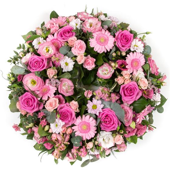 A gorgeous, pretty in pinks loose wreath. Inclusive of pink germini, pink roses and an array of delicate pink flowers.