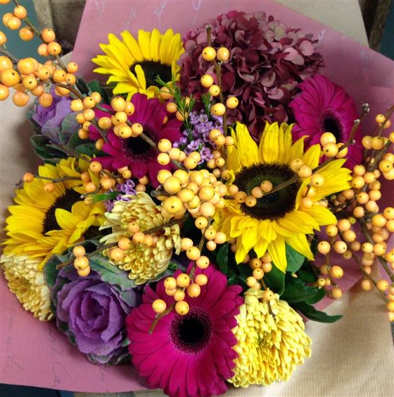Stunning selection of sunflowers, berries and cerise gerberas.