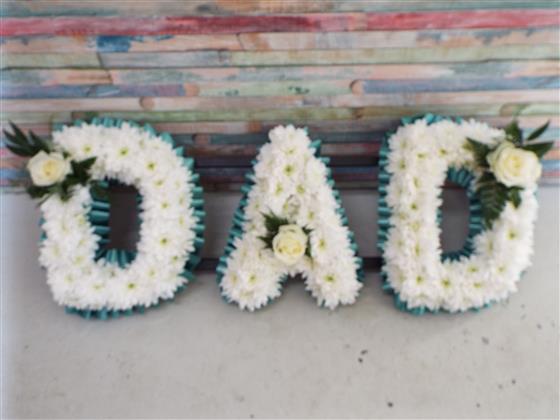 DAD Letters with Chrysanthemum basing and ribbon edge.
