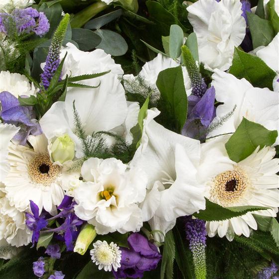 This traditional elegant wreath made up of seasonal flowers and foliage can be made like the picture in white and purples. The base colour is white but please choose your accent flower colour. If you would perfer it made with another colour other than white please call us.