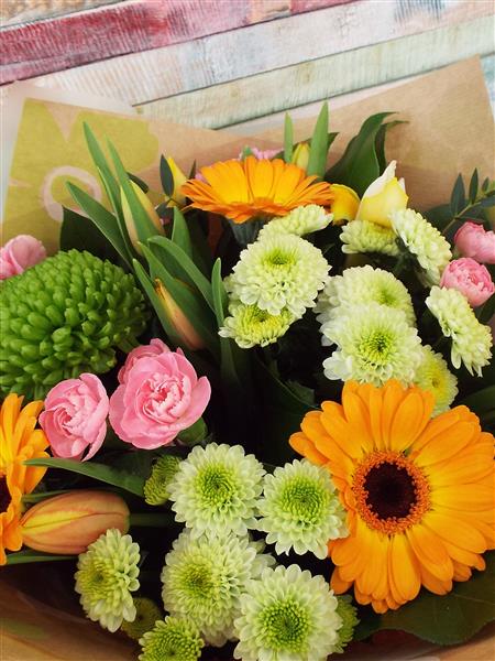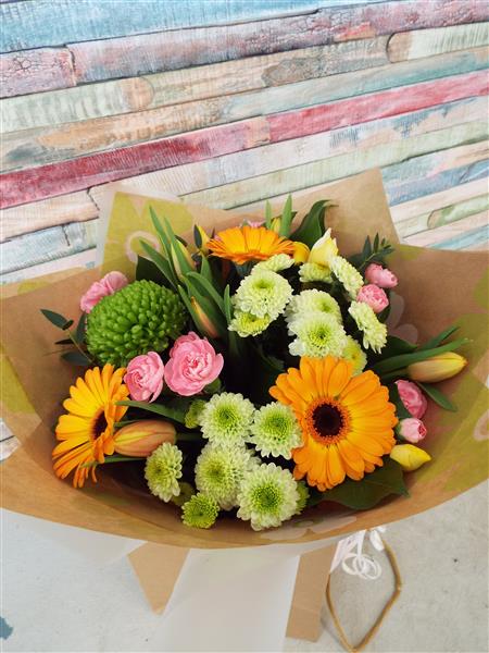 A sweet bright and happy hand-tied in water in seasonal flowers.