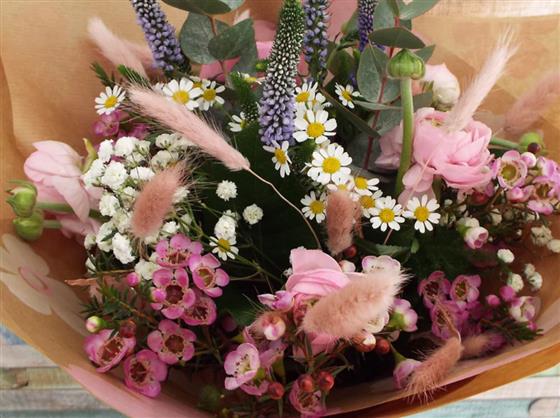 A pretty delicate tied bunch of flowers. Gift wrapped with no water. A perfect little bunch to put a smile on a little ones face.